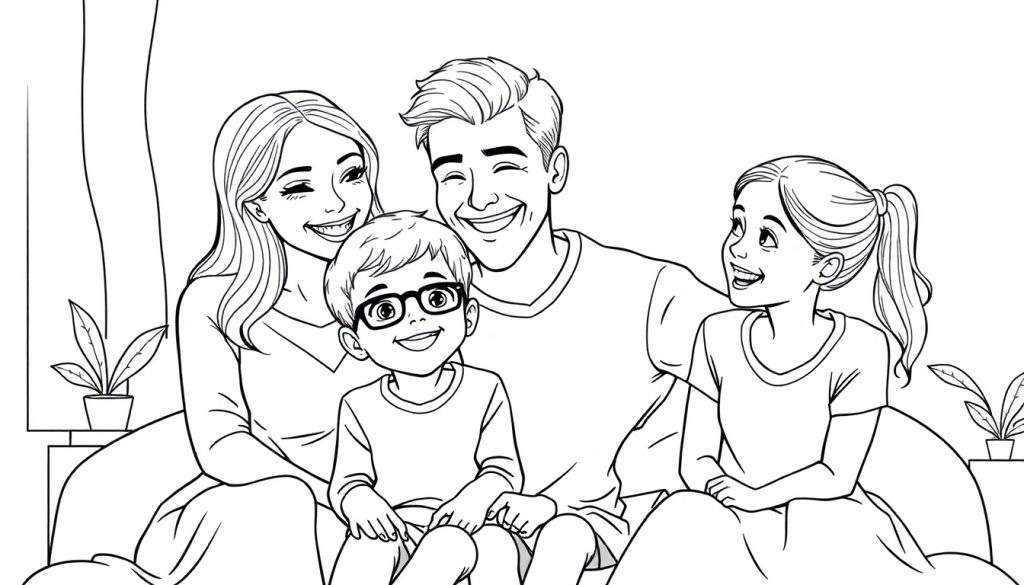 Klaar om te kleuren! 🎨 Dit is een superleuke kleurplaat van een familie die heel blij is. Papa, mama, de stoere jongen met zijn bril en het lieve meisje, ze lachen allemaal. Omringd door groene plantjes, voelt het als een warme knuffel. Wat een fijne dag! Laten we deze kleurplaat met veel kleur vullen en er een prachtig kunstwerk van maken. Welke kleuren ga jij gebruiken voor de bloemen en de kleren van het gezin? Ik kan niet wachten om het te zien!