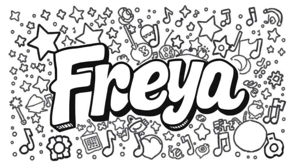 Wow, kijk eens hoe cool deze kleurplaat is! ✨ De naam ‘Freya’ danst in stoere letters, omringd door een feestje van sterren 🌟, muziek 🎶 en bloemen 🌸! Heb jij al zin om deze kleurplaat met jouw allermooiste kleuren tot leven te brengen? Maak er een echt meesterwerk van! Klaar om te kleuren? Laat je creativiteit de vrije loop en maak er iets prachtigs van! Veel kleurplezier!