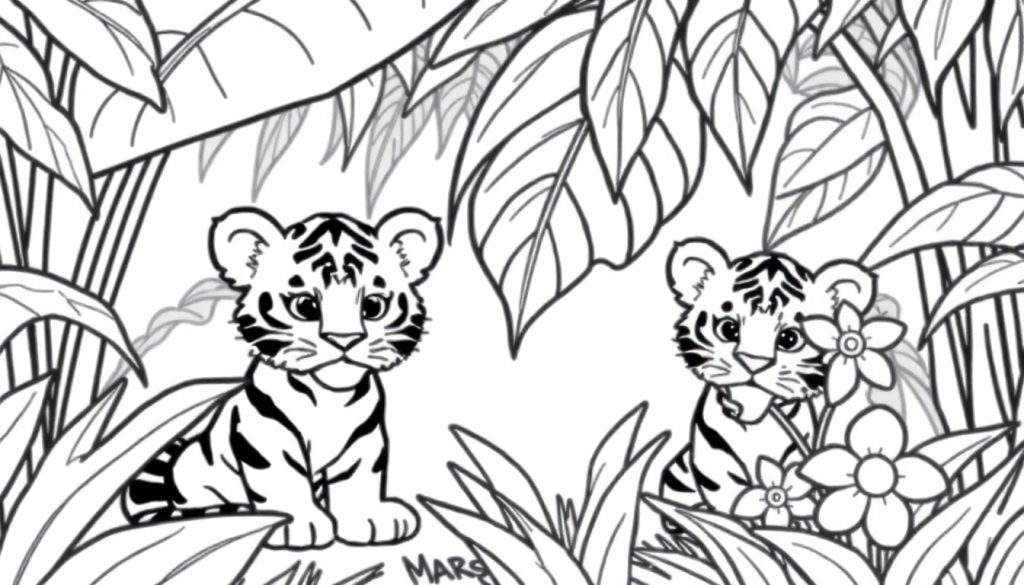 Roar! 🐯 Twee super schattige tijgerwelpjes verstoppen zich in de jungle. Kun jij raden welke kleur ze straks krijgen? Dit is een super leuke kleurplaat om mee aan de slag te gaan. Laat je creativiteit de vrije loop en maak deze jungle nog kleurrijker! Welk kleurtje krijgt het blaadje en welke kleur de bloemetjes? Super veel plezier met deze leuke kleurplaat!