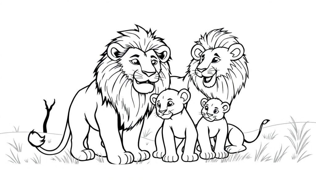Kleurplaat: Lieve Leeuwenfamilie in de Savanne
