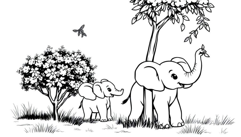 Kijk eens wat een lieve olifantjes! 🐘 Dit is een superleuke kleurplaat voor jou. De grote olifant geniet van een blaadje onder de boom. 🌳 De kleine olifant kijkt naar de bloemetjes. 🌸 Vlieg jij met het insectje mee de lucht in? 🦋 Kleur deze tekening zo mooi als je kunt!