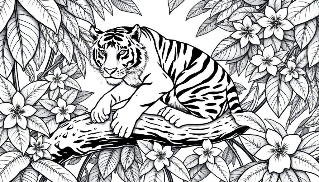 Kijk eens wie we daar hebben! 🐅 Deze dappere tijger is even aan het uitrusten op een dikke boomstam. Wat vind jij dat deze tijger droomt? Misschien wel van een heerlijke maaltijd of een avontuur tussen de klimop en de kleurrijke bloemen! Pak je kleurpotloden en geef dit plaatje jouw eigen jungle-look. Veel kleurplezier met deze leuke kleurplaat!