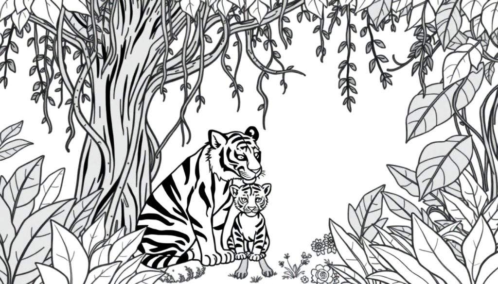 Kijk eens wat een schattige tijgerfamilie! 🐅 Moeder tijger en haar kleintje spelen samen in de jungle. Wat een avontuurlijke kleurplaat! Heb jij al een mooie kleur in gedachten voor hun vacht? Misschien een fel oranje met zwarte strepen, of toch een heel andere kleur? 🎨 De jungle zit vol met planten en bloemen, dus er is genoeg om te versieren. Pak je potloden en maak deze kleurplaat tot een meesterwerk! Veel kleurplezier!