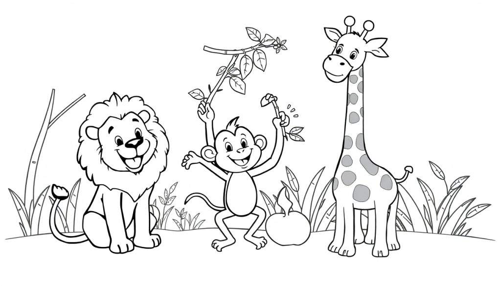 Wat een vrolijke kleurplaat! 🦁🐒🦒 Welk dier vind jij het leukst om in te kleuren? Misschien de stoere leeuw, de ondeugende aap of de lange giraffe? Of geef je de appel een speciale kleur? Laat je fantasie de vrije loop en maak deze jungle compleet met jouw mooiste kleuren! Pak je potloden en ga aan de slag met deze dieren kleurplaat!