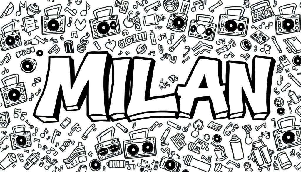 Laat je creativiteit de vrije loop met deze supergave Milan graffiti kleurplaat! 🎨 Milan’s naam staat er in dikke letters, klaar om ingekleurd te worden. Omringd door alle coole muziekdingen wordt dit jouw meesterwerk. Van de boombox tot de muzieknootjes, jij bepaalt de kleuren! 🎶 Pak je stiften, potloden of verf en maak er iets fantastisch van. Een echte kunstenaar ben jij! 🌟