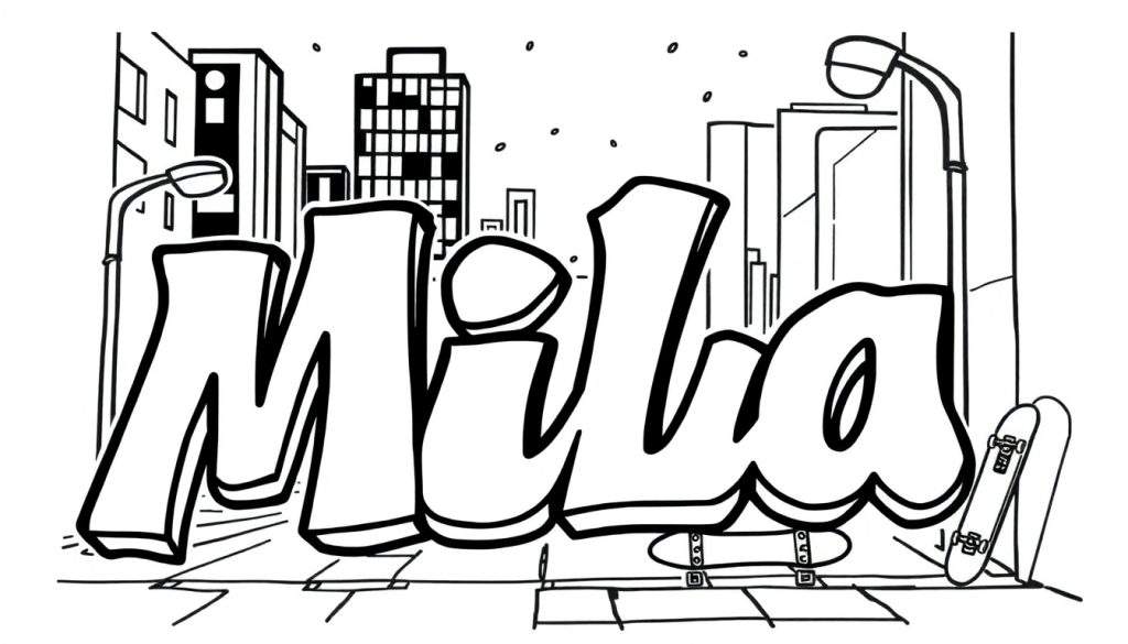 Hé Mila! Wil jij deze stoere naam in graffiti-stijl inkleuren? 🎨 Dit is een superleuke kleurplaat met een te gekke achtergrond van een stad! Je ziet hoge gebouwen 🏙️ en gezellige straatlantaarns 💡. Pak je potloden 🖍️ en maak deze naam helemaal van jou! Waar ga jij de letters mee vullen? Misschien met regenboogkleuren of juist met stoere, donkere tinten? Laat je creativiteit de vrije loop en maak van deze kleurplaat jouw eigen meesterwerk!