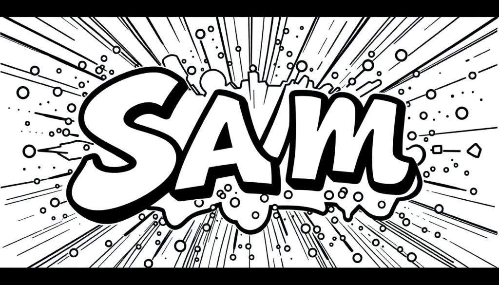 Wow! Kijk eens hoe cool deze kleurplaat is! 🤩 De naam SAM knalt van het papier af, net als vuurwerk! 💥 De letters lijken te dansen en te springen met al die lijnen en stipjes eromheen. 🎈 Je kunt deze pagina helemaal zelf invullen met jouw favoriete kleuren. Wordt het een regenboog? Of misschien wel alles in het rood en blauw? 🎨 Laat je fantasie de vrije loop en maak van deze zwart-witte plaat een stralend meesterwerk! Veel kleurplezier, held! ✨