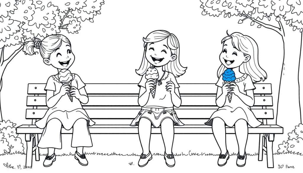 Kijk hoe blij deze drie vriendinnen zijn met hun ijsjes! 🍦🍦🍦 Ze zitten heerlijk in het zonnetje te genieten. Dit is de perfecte kleurplaat om lekker creatief mee te zijn. Pak je kleurtjes erbij en maak dit parkje extra vrolijk! Wat is jouw lievelingsijsje? 🍓🍌🍫 Laat het ons weten!