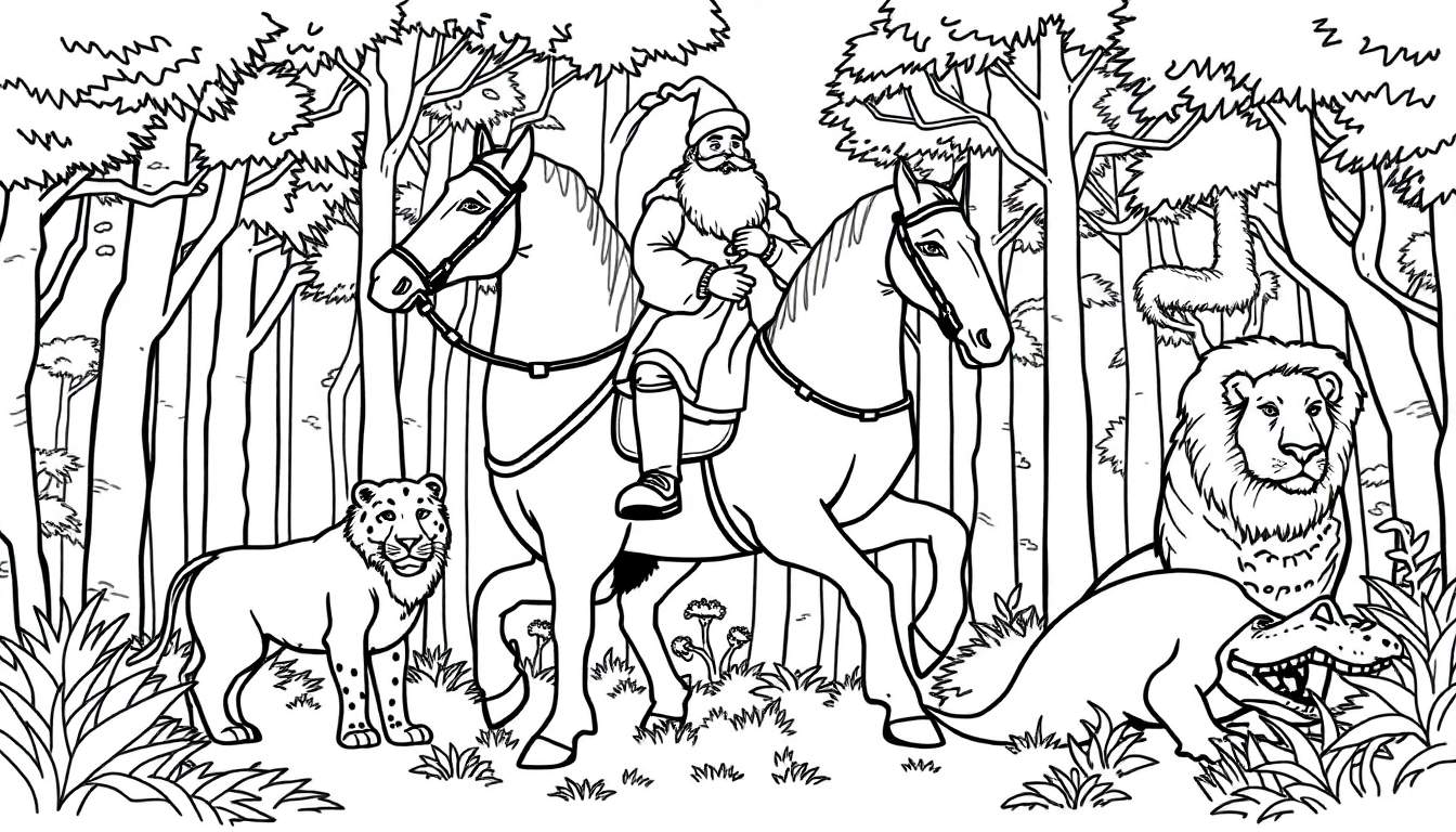 Een gedetailleerde zwart-wit kleurplaat die een avontuurlijke scène uitbeeldt. Centraal staat een man met een lange baard en puntmuts, rijdend op een paard en een ander paard leidend. Ze navigeren door een weelderig bos vol hoge bomen en dichte begroeiing. Om hen heen bevinden zich diverse wilde dieren: een luipaard op de voorgrond, een luiaard die aan een tak hangt, een majestueuze leeuw en een krokodil met open bek. Een perfecte plaat voor uren kleurplezier en fantasie!