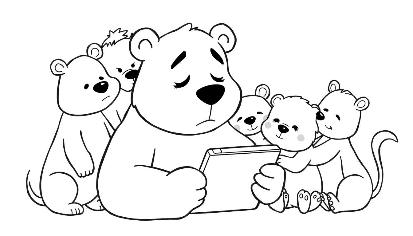 Een schattige zwart-wit tekening van een groep beren, perfect als kleurplaat. Een grote beer leest voor uit een tablet of boek, omringd door vrolijke en bezorgde berenwelpen. Ideaal voor creatieve kinderen en berenliefhebbers.