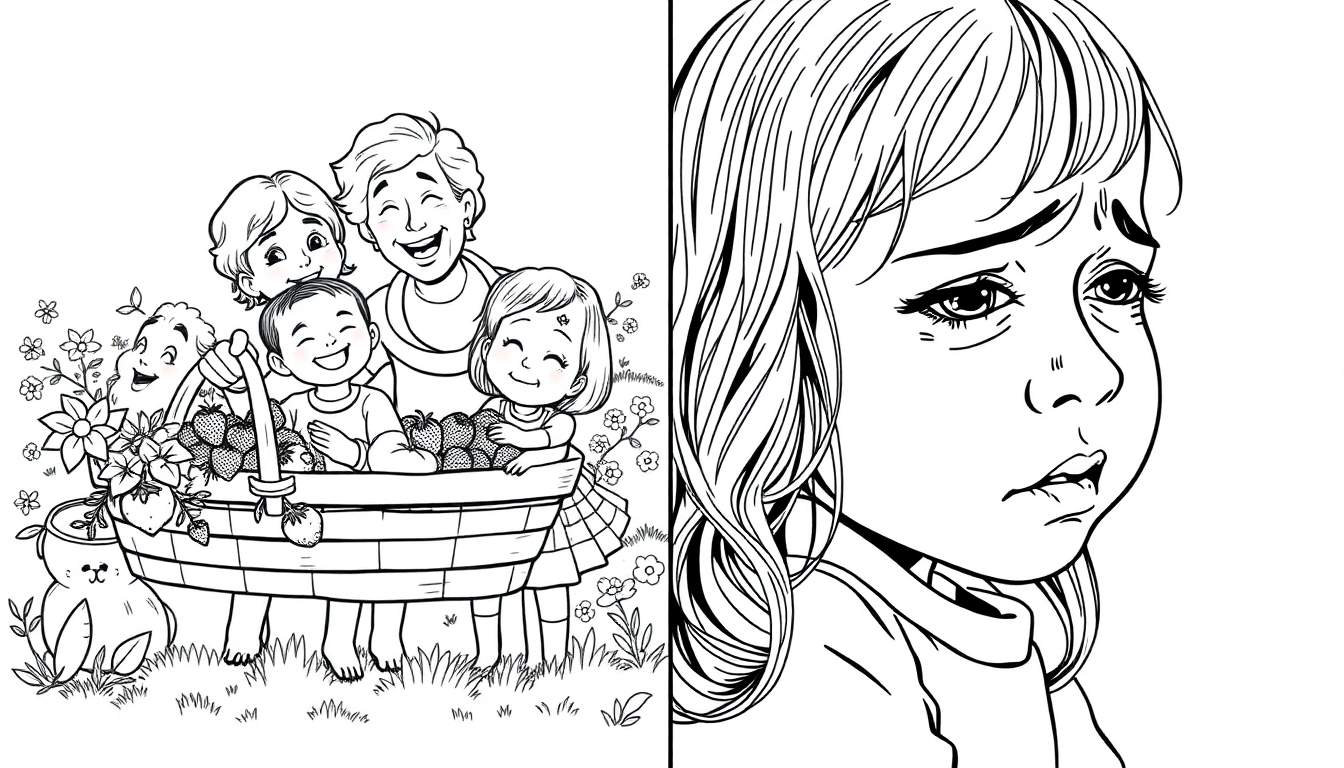 Een dubbele lijntekening, ideaal voor kleurplaten, die aan de linkerkant een vrolijke familiebijeenkomst viert met een overvloed aan aardbeien en aan de rechterkant een hartverscheurend portret van een verdrietig meisje met tranen in haar ogen. Een krachtige visuele weergave van tegenstrijdige emoties.