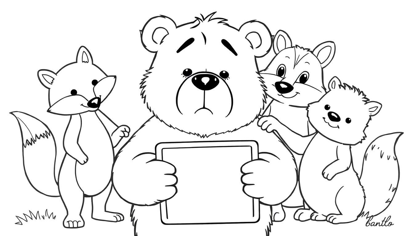 Deze unieke zwart-wit tekening, perfect om in te kleuren, toont een prachtig tafereel van vriendschap en troost. In het hart van de compositie staat een grote, vriendelijke beer, wiens fronsende wenkbrauwen en trieste mond een vleugje melancholie uitdrukken. Hij houdt een leeg, rechthoekig bord vast, alsof hij wacht op een boodschap of een teken van hoop. Zijn ogen, groot en zwart, kijken de kijker aan met een mengeling van verdriet en verwachting. De tekening, gesigneerd door ‘bantlo’, nodigt uit om met kleur tot leven gebracht te worden.