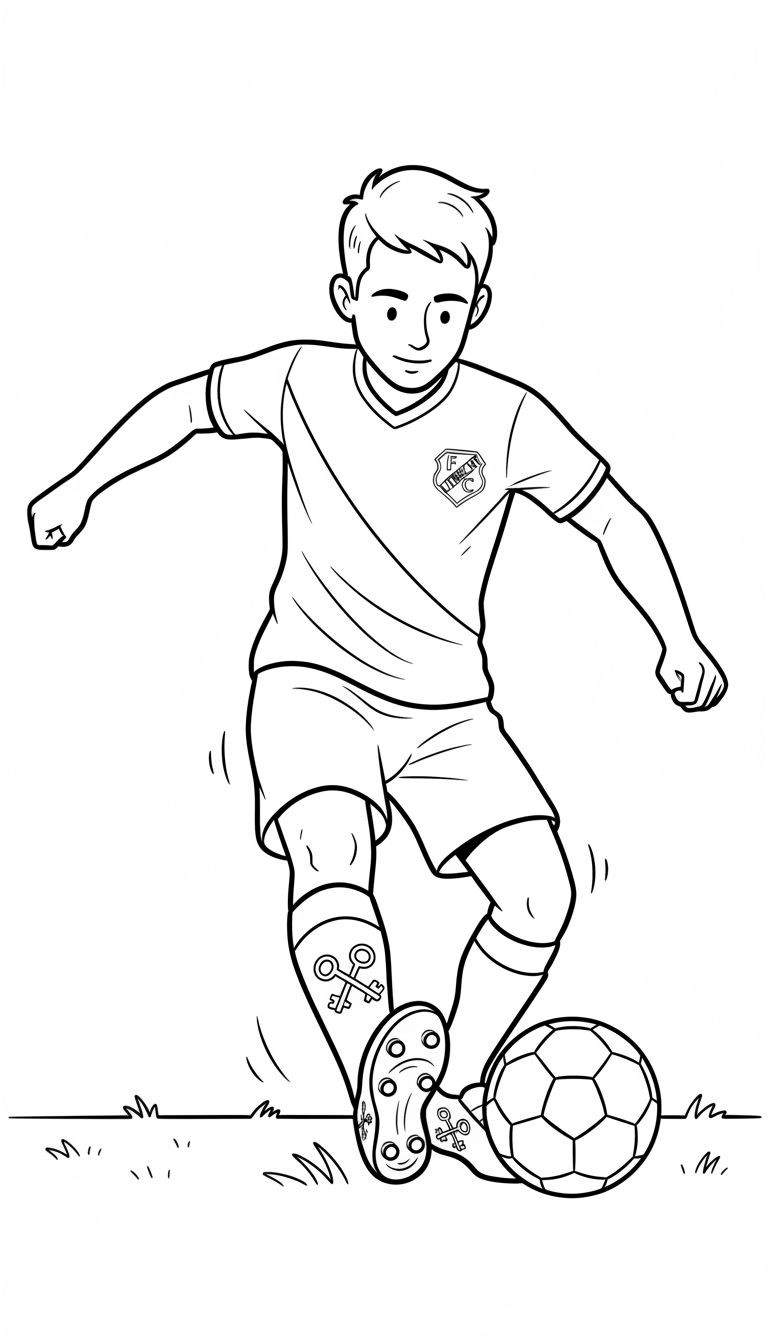 Maak je klaar voor urenlang kleurplezier met deze dynamische zwart-wit lijntekening, speciaal ontworpen voor jonge voetbalfans. De kleurplaat toont een jonge voetballer in actie, vol concentratie en passie, precies zoals we onze helden op het veld zien. Hij staat op het punt de bal te dribbelen of te passen, wat de verbeelding prikkelt en uitnodigt om dit spannende sportmoment tot leven te brengen met kleur.
