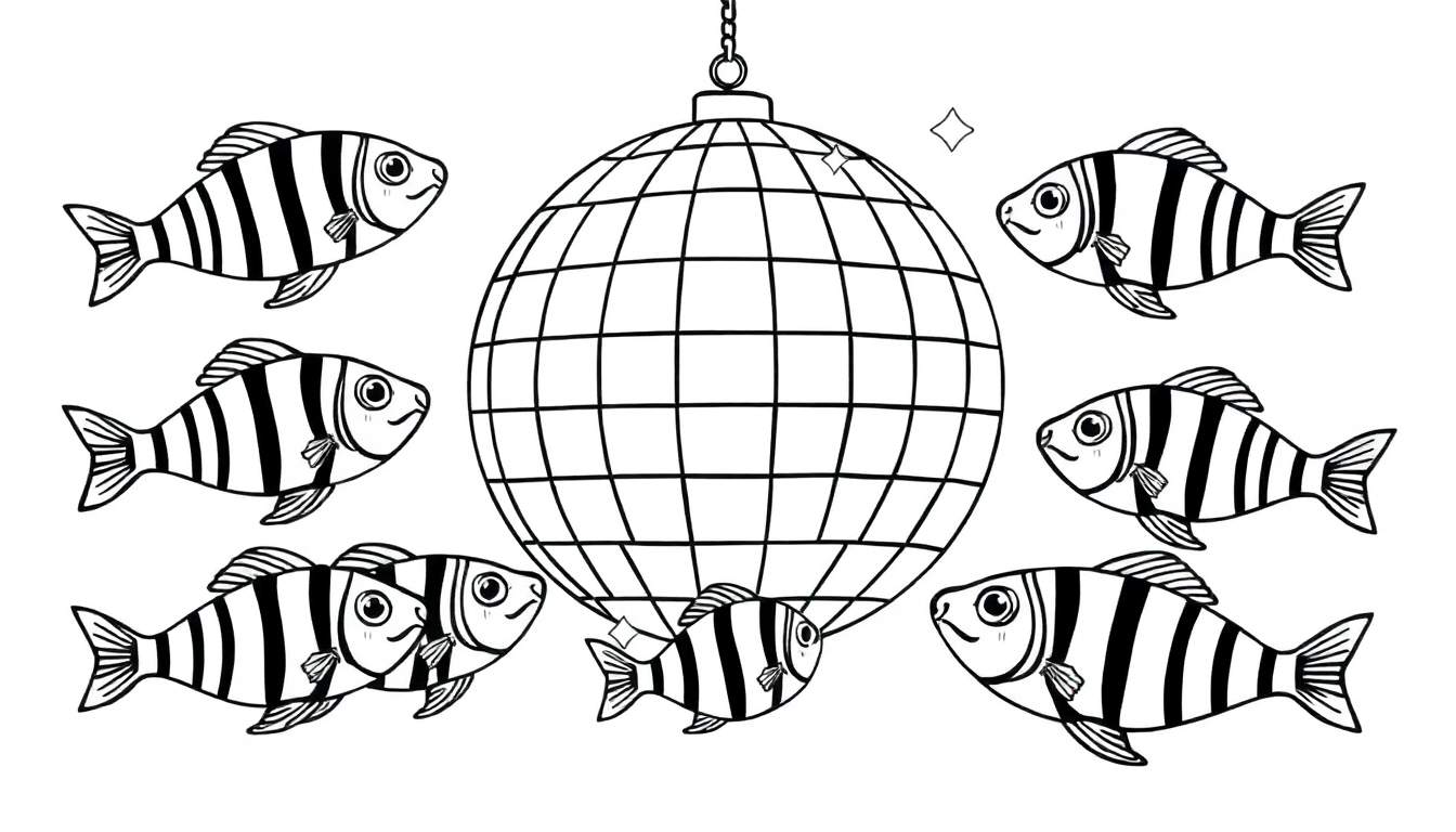 Een vrolijke zwart-wit lijntekening van een onderwaterscène. Een grote discobal hangt centraal, omringd door zeven lachende gestreepte vissen. Ideaal voor uren kleurplezier!