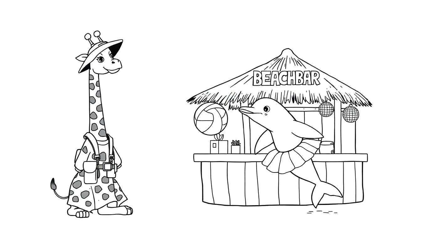 Een vrolijke zomerse kleurplaat met een giraf in safari-outfit en een dolfijn in een balletrokje achter een BEACHBAR. Perfect voor uren kleurplezier!