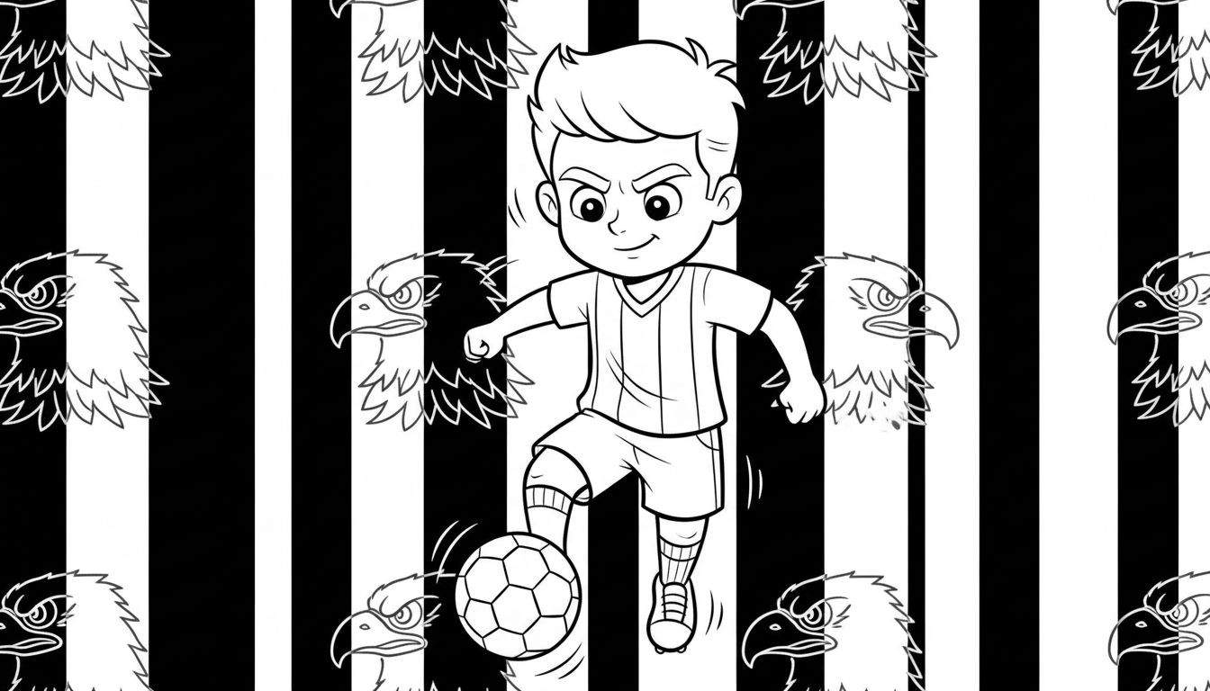 Duik in de wereld van Go Ahead Eagles met deze unieke zwart-wit lijntekening, perfect om in te kleuren! De kleurplaat toont een vastberaden jonge voetballer in een gestreept tenue, die met een ondeugende glimlach de bal schopt. Op de achtergrond, tussen de iconische zwart-witte strepen, loeren felle adelaarskoppen met een boze uitdrukking, wat zorgt voor een spannende en dynamische sfeer. Ideaal voor jonge fans en creatieve geesten!