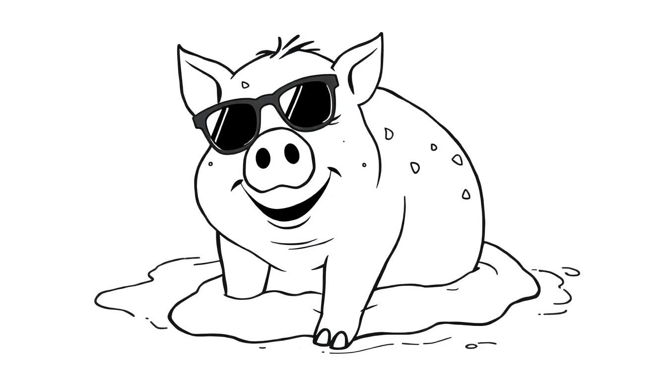 Een vrolijke zwart-wit tekening van een cartoonachtig varkentje dat geniet van een modderbad. Het varken draagt een coole zonnebril en heeft een brede glimlach, wat de afbeelding schattig en grappig maakt. Ideaal voor kinderen om in te kleuren!