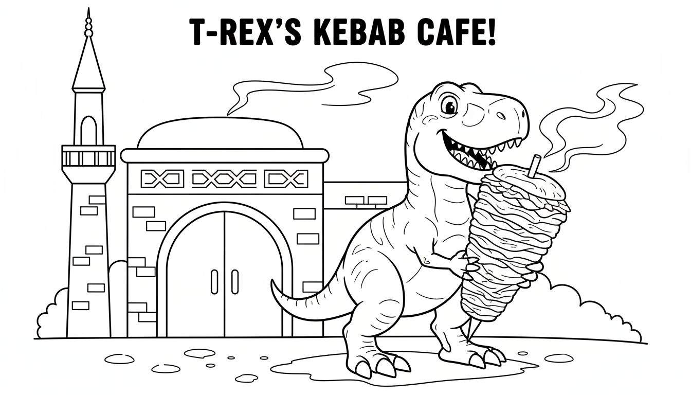 De setting van de kleurplaat is al even verrassend. Achter de joviale dinosaurus verrijst een prachtig gebouw dat doet denken aan oosterse architectuur, compleet met een glimmende koepel en een sierlijke minaret. Ook van dit gebouw ontsnapt wat damp, wat suggereert dat de keuken hier op volle toeren draait. De tekst “T-REX’S KEBAB CAFE!” bovenaan de afbeelding bevestigt de unieke aard van deze plek: een eetgelegenheid waar prehistorische en moderne elementen op een speelse manier samenkomen. Kleine details op de grond, zoals stenen en plasjes, geven de scène extra diepte en maken het een levendig tafereel om in te kleuren.