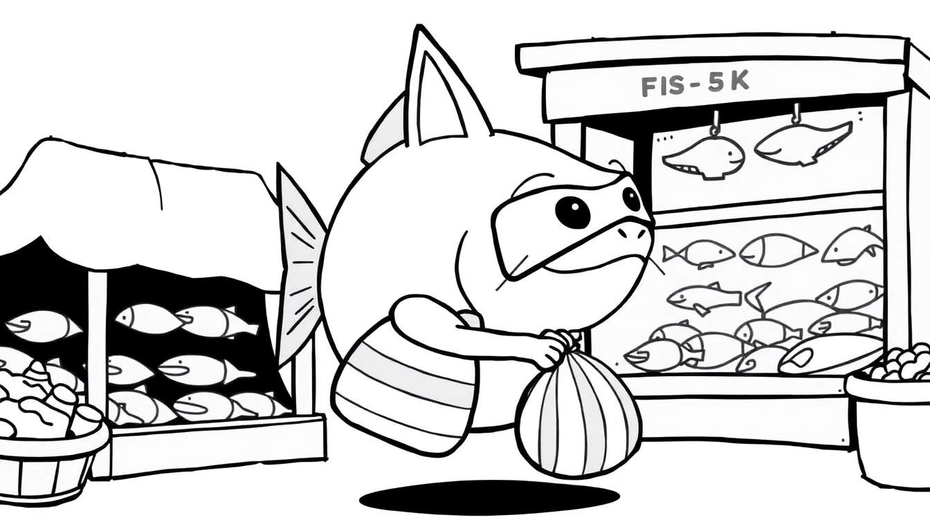 De omgeving spreekt boekdelen: een levendige vismarkt! Aan de linkerkant wordt de scène verrijkt door een open marktkraam, compleet met luifel en stapels vis die uitnodigend in bakken en manden liggen. De rechterkant toont een grotere, gesloten viswinkel of kraam, waar de geuren van verse vis waarschijnlijk al van ver te ruiken zijn. Boven de kraam prijkt de tekst ‘FIS-5K’, een knipoog naar de locatie, terwijl onderaan nog meer vis en zeevruchten uitgestald liggen, en een emmer vol lekkers klaarstaat. De absolute clou? De vis zelf bevindt zich op de vismarkt om vis te kopen!