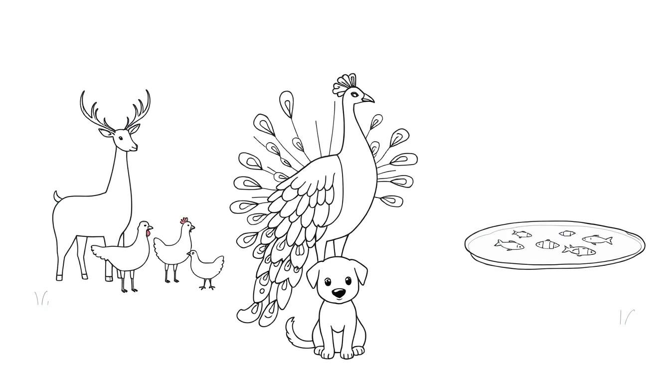 Download deze gratis zwart-wit lijntekening kleurplaat met een prachtig hert, vrolijke kippen, een majestueuze pauw, een schattige puppy en zes vissen in een schaal. Perfect voor uren knutselplezier voor kinderen van alle leeftijden.