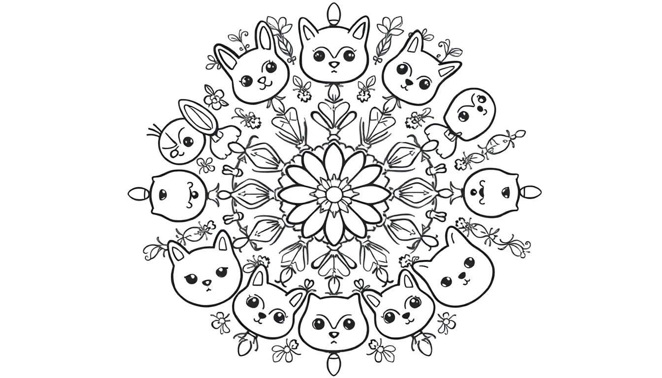 Wat deze kleurplaat extra speciaal maakt, zijn de acht charmante dierengezichtjes die zich in de buitenste ring verstoppen. Twee lieve konijntjes met hun lange oren, twee ronde, vrolijke vogeltjes of kuikentjes met kleine snaveltjes, en vier speelse poesjes of vosjes met puntige oortjes en verrassende uitdrukkingen, wisselen af met de decoraties. Ze brengen een speelse en lieve sfeer aan het ontwerp. Vergeet ook de subtiele details niet: kleine bloemetjes, blaadjes en zelfs een paar schattige insectjes zoals bijtjes verrijken het plaatje en bieden nog meer mogelijkheden om je creativiteit de vrije loop te laten.