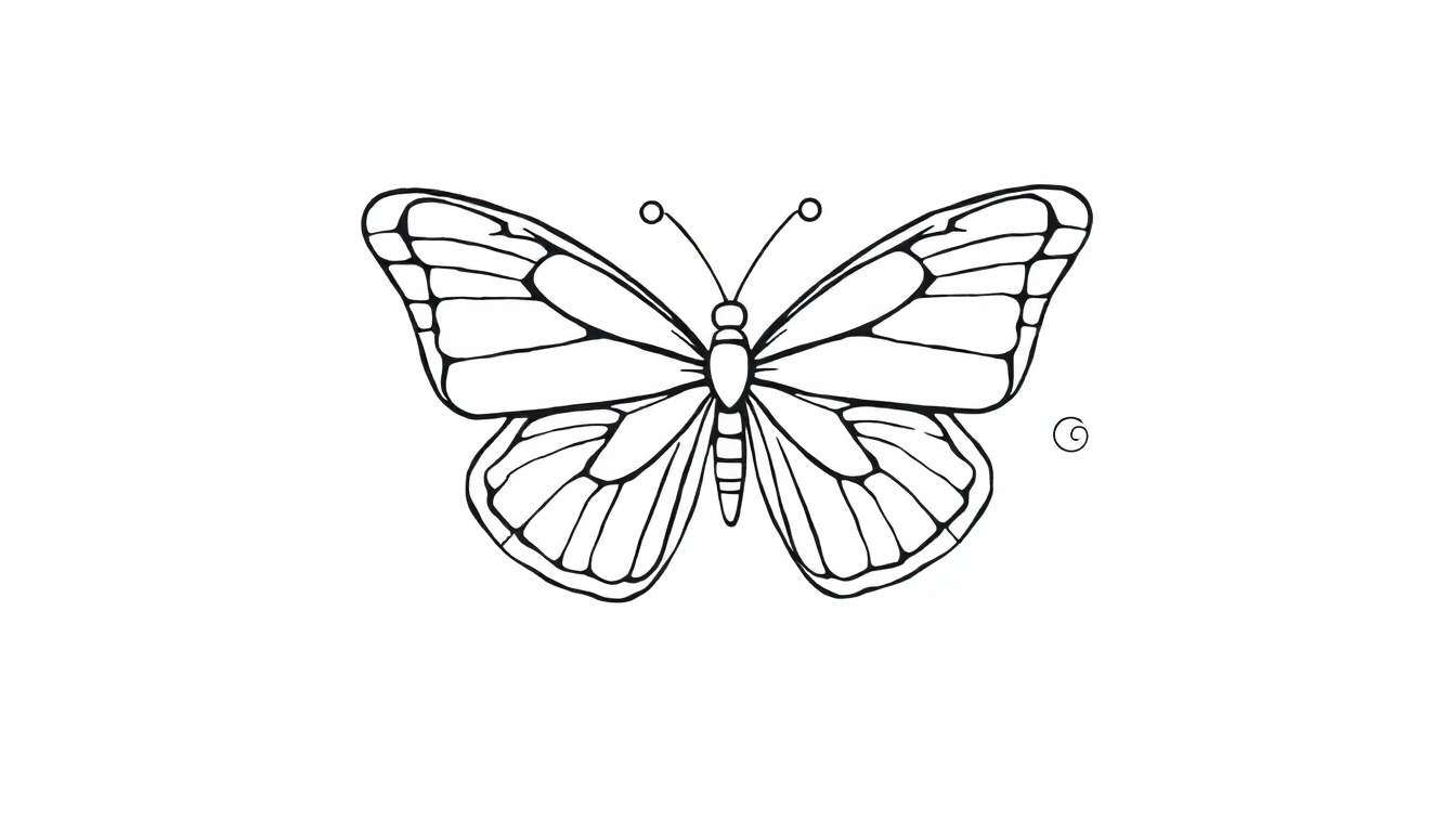 Download deze gratis zwart-witte lijntekening van een prachtige vlinder, perfect om creatief in te kleuren! De gedetailleerde tekening toont een symmetrische vlinder met een langwerpig lichaam, twee antennes met bolletjes en vier vleugels opgedeeld in vakken. Rechtsonder is een kleine spiraalvormige krul te zien. Een ideale activiteit voor jong en oud!