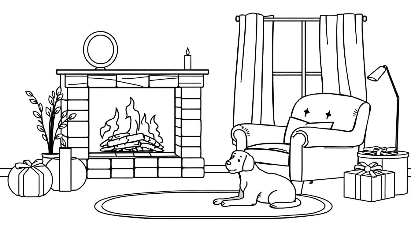 Een gedetailleerde kleurplaat van een knusse woonkamer, compleet met brandende open haard, een slapende hond, comfortabele fauteuil, bijzettafel met cadeaus en boeken, en een staande lamp. Perfect om in te kleuren en een warme sfeer te creëren.
