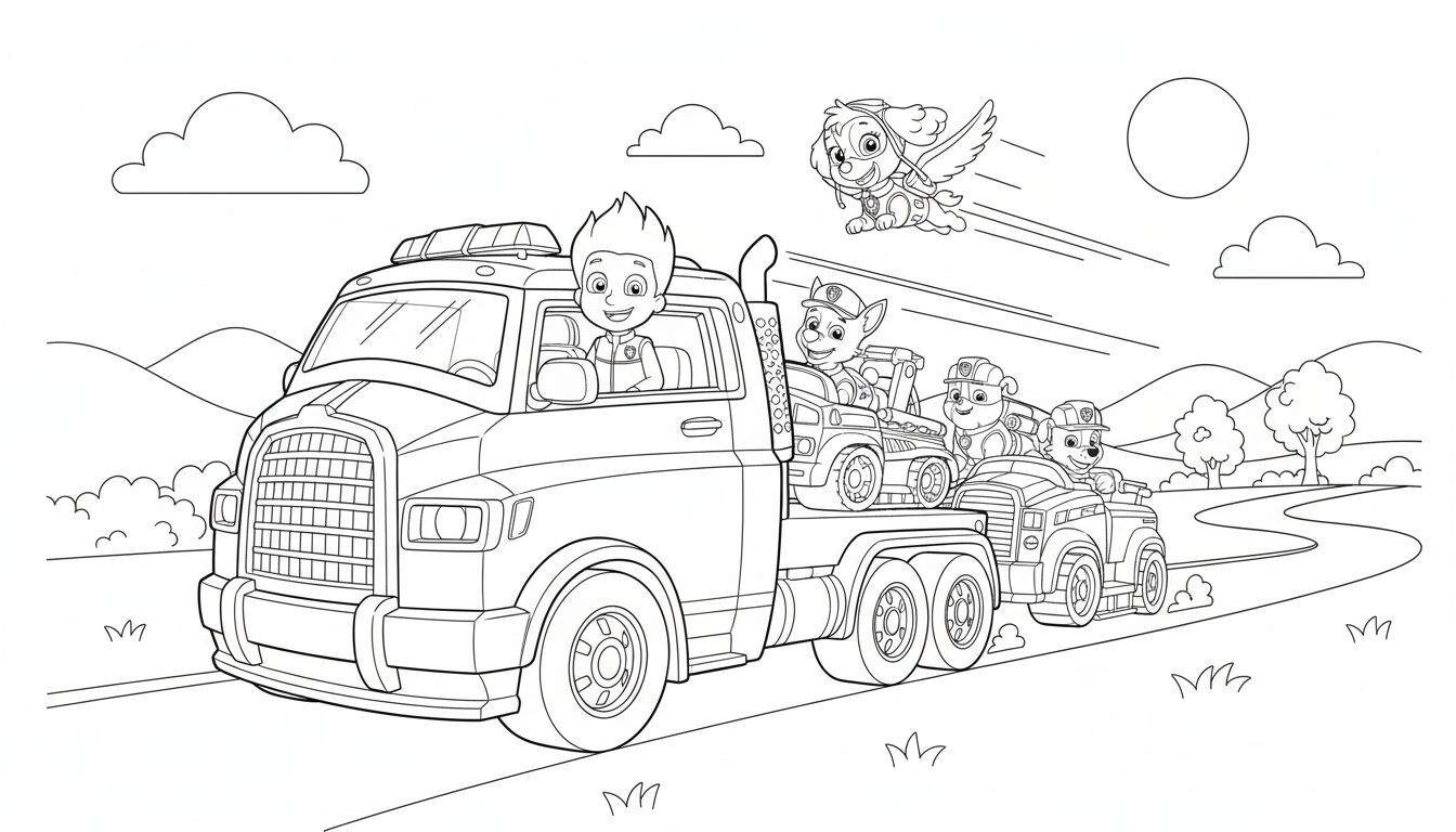 Duik in de spannende wereld van Paw Patrol met deze gedetailleerde zwart-wit kleurplaat! Zie hoe Ryder lachend in zijn grote, stoere vrachtwagen rijdt over een slingerende weg. Op de laadbak staan Chase in zijn politie-SUV en Rubble in zijn graafmachine-voertuig, samen met een derde, onbekende pup in zijn eigen voertuig. Boven hen zweeft de vrolijke Skye, met vleugels uitgespreid en snelheidsstrepen die haar vliegkunsten benadrukken. Het avontuur speelt zich af in een prachtig buitenlandschap met glooiende heuvels, bomen, struiken en wolken aan de hemel. Een lege cirkel rechtsboven wacht op de zon of maan, klaar om door jouw fantasie gevuld te worden. Deze afdrukbare kleurplaat is perfect voor jonge fans om hun favoriete helden in te kleuren!