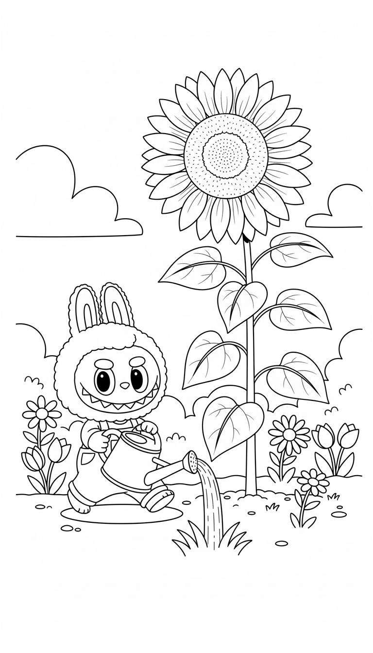 Labubu Konijntje Kleurplaat: Vrolijk Tuinieren met Zonnebloem en Gieter