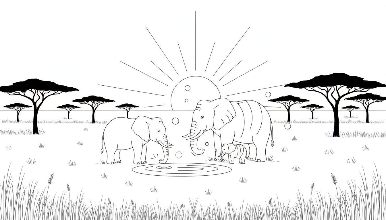 Een vrolijke kleurplaat met een Afrikaans savannelandschap. Geniet van het inkleuren van een olifantenfamilie bestaande uit twee volwassen olifanten en een schattig babyolifantje, drinkend bij een waterplas. Op de achtergrond een warme zon, acaciabomen en gras. Perfect voor urenlang kleurplezier!