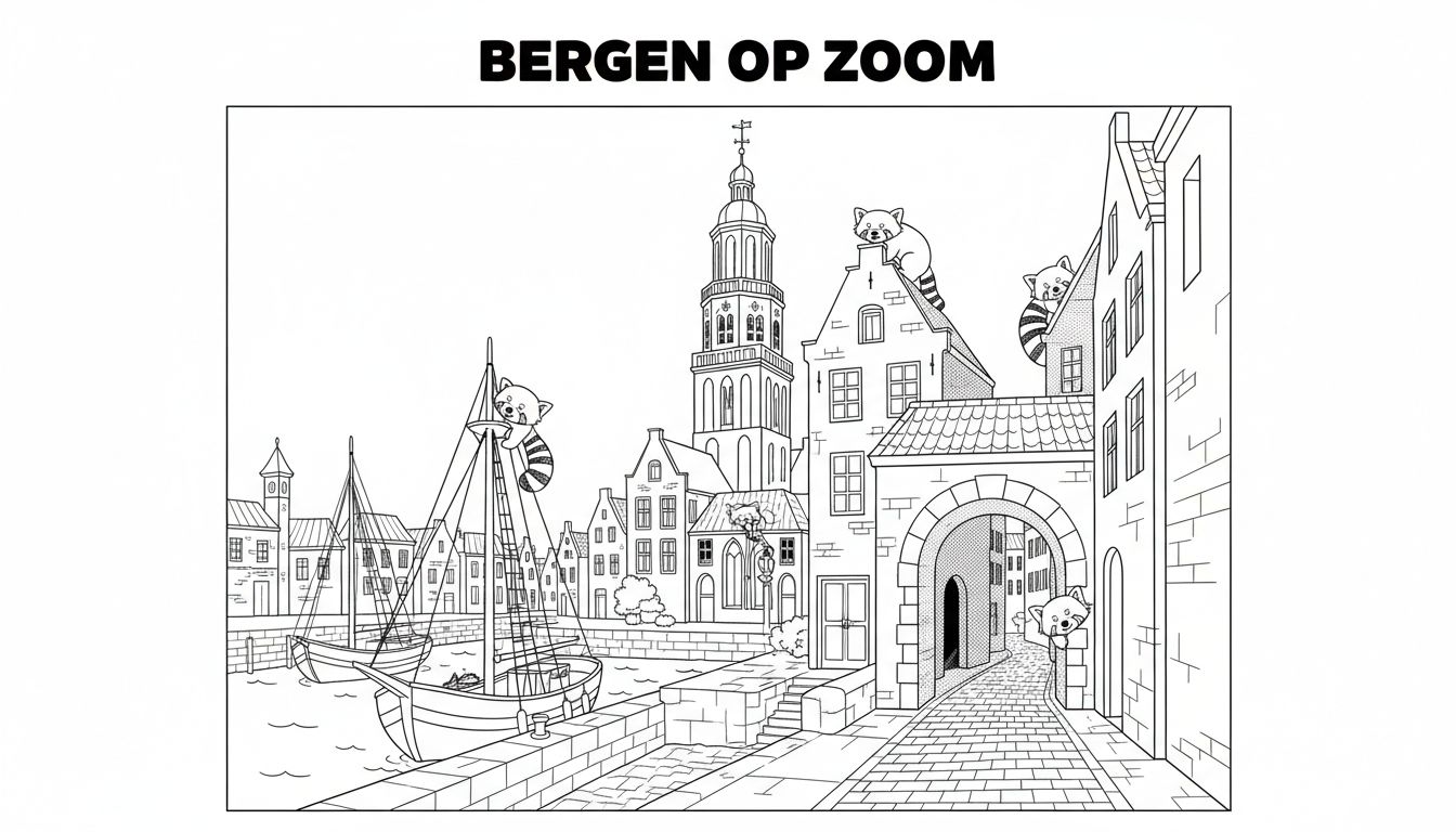 Gedetailleerde zwart-wit kleurplaat van het historische stadsgezicht van Bergen op Zoom. Ontdek de grachten, traditionele zeilboten, Nederlandse architectuur, een imposante kerktoren en een oude stadspoort. Extra leuk: zoek de vijf verborgen rode panda’s die zich in het tafereel schuilhouden!