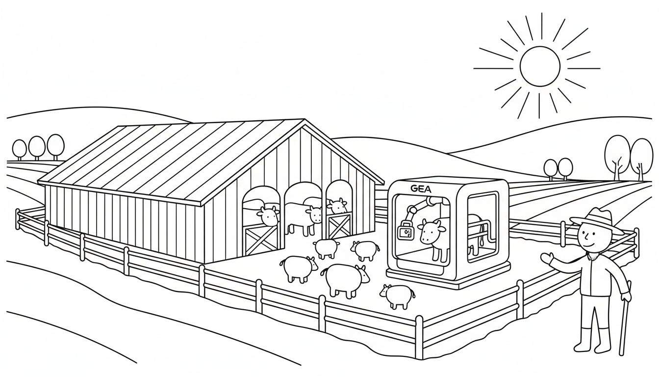 Een gedetailleerde zwart-wit kleurplaat van een boerderijlandschap. De prent toont een traditionele boerderij met koeien in de stal en in de wei. Opvallend is de integratie van moderne technologie met een GEA melkrobot, waar een koe gemolken wordt. Op de achtergrond glooiende heuvels, bomen en een zon met stralen. Een vriendelijke boer met een hoed begroet de kijker. Ideaal voor kinderen om de wereld van de landbouw te ontdekken en creatief in te kleuren.