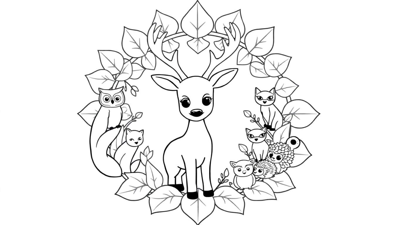 Een schattige zwart-wit kleurplaat vol bosdieren in een natuurlijke krans van bladeren en takken. Perfect om de creativiteit van kinderen te stimuleren en urenlang kleurplezier te bieden.