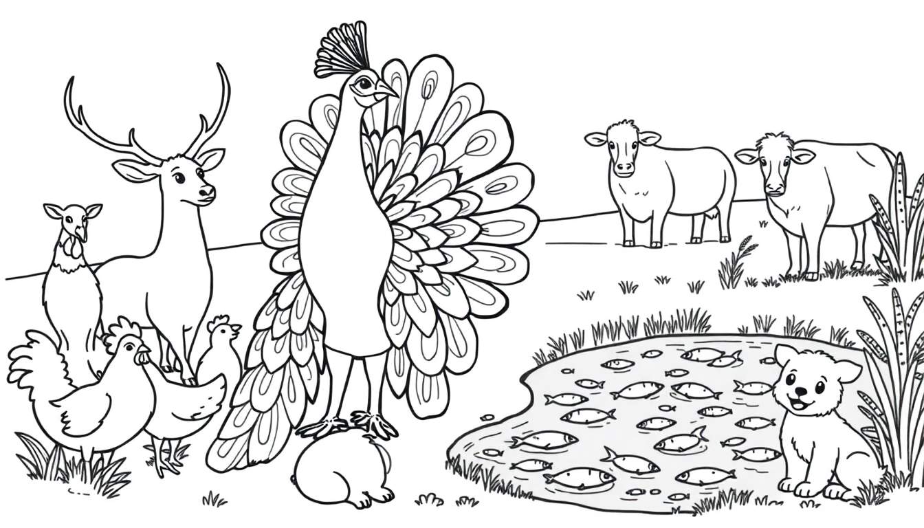 Kleurplaat: Dieren in de Weide – Hert, Pauw, Kippen, Koeien en Puppy