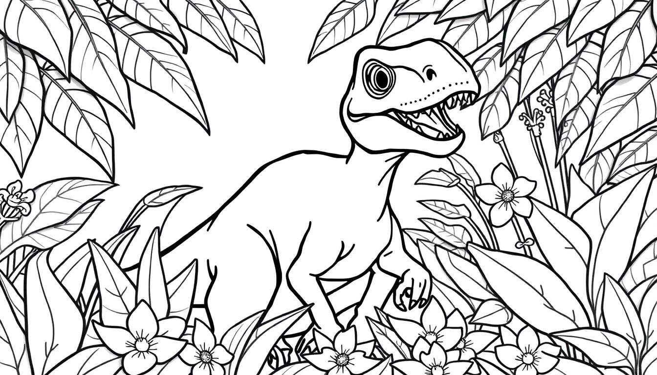 Download deze gratis kleurplaat van een stoere roofdierachtige dinosaurus omringd door weelderige junglebladeren en kleurrijke bloemen. Perfect voor jonge dinosaurusfans om hun creativiteit de vrije loop te laten!