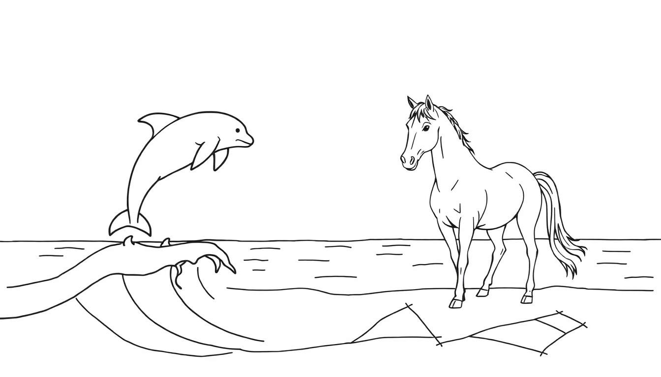 Kleurplaat: Dolfijn Springt Uit Water Naast Paard op Strand