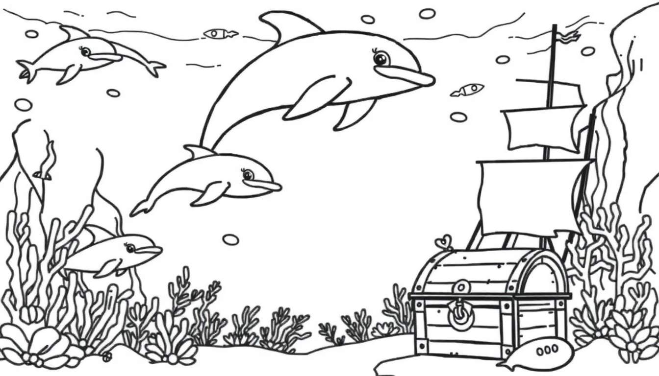 Een betoverende zwart-witte kleurplaat die een levendige onderwaterwereld voorstelt, compleet met vijf speelse dolfijnen, weelderig zeewier, kleurrijk koraal, de mysterieuze resten van een gezonken schip en een verborgen schatkist. Perfect voor creatieve kinderen om tot leven te brengen met hun favoriete kleuren.