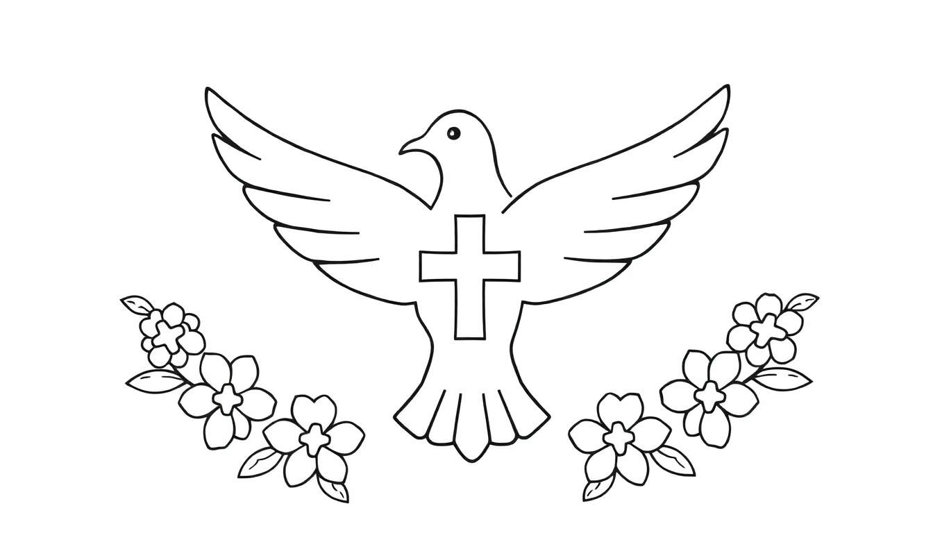 Ontdek deze prachtige zwart-witte lijntekening, perfect als kleurplaat! Het middelpunt is een duif met gespreide vleugels en een symbolisch kruis op de borst. Sierlijke bloemranken omringen de duif en nodigen uit tot creativiteit.