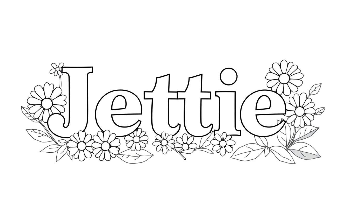 Gratis kleurplaat met de naam ‘Jettie’ in dikke letters, omringd door vrolijke bloemen en blaadjes, perfect voor creatieve kinderen.