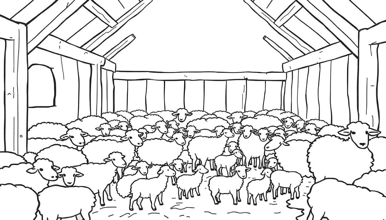 Gratis kleurplaat van een gezellige, overvolle schaapskooi met talloze schapen van alle leeftijden. Perfect om in te kleuren en de warmte van de stal te ervaren.