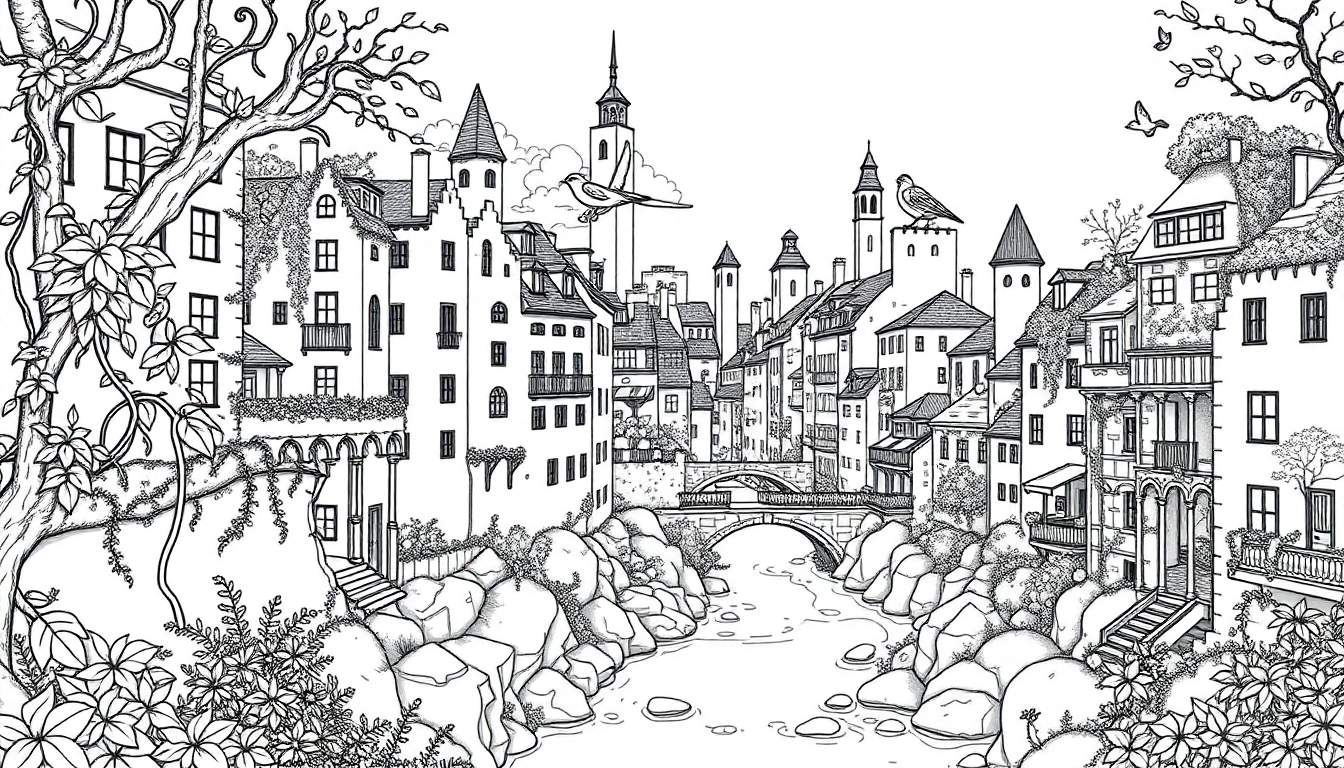 Ontdek deze gedetailleerde zwart-witte kleurplaat van een charmante stad aan een kronkelende rivier. Een sprookjesachtig stadslandschap met middeleeuwse gebouwen, hoge torens, bruggen en weelderige natuur, compleet met vliegende en zittende vogels, wacht om tot leven gekleurd te worden.