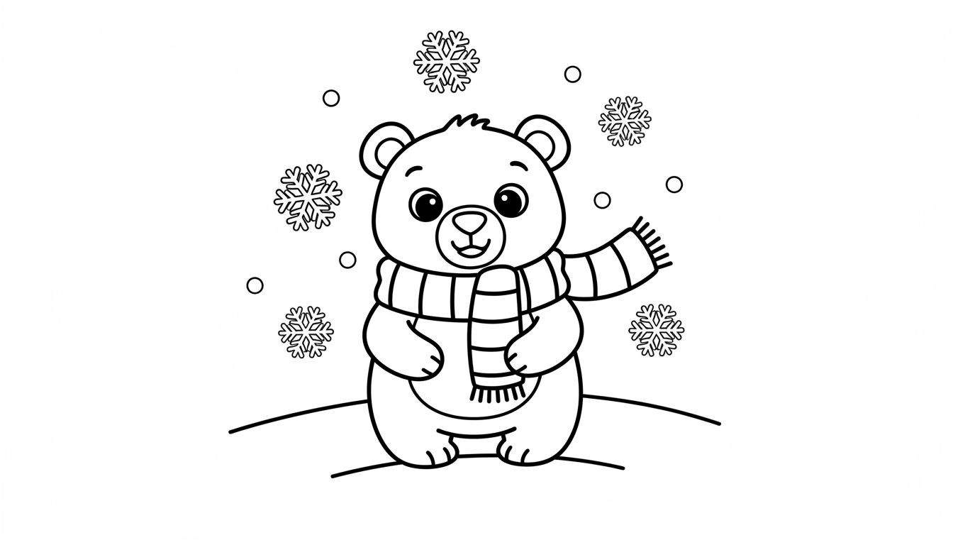 Ontdek deze charmante zwart-wit lijntekening, perfect als kleurplaat voor jong en oud. De afbeelding toont een schattige, vriendelijke beer die een gestreepte sjaal draagt, omringd door dwarrelende sneeuwvlokken. De beer staat op een besneeuwde ondergrond, wat het geheel een gezellig wintertafereel maakt. Ideaal voor beginnende kleurders dankzij de duidelijke lijnen en het eenvoudige onderwerp.