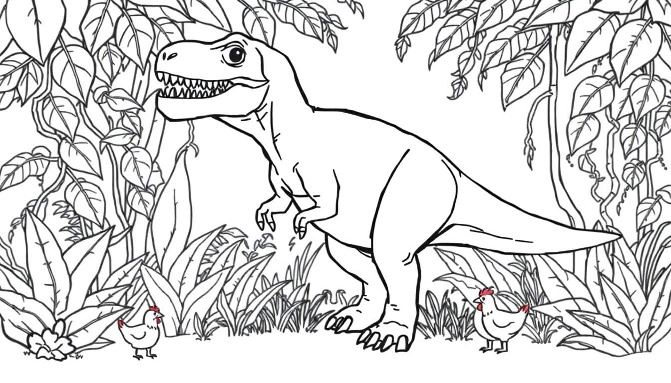 Download deze gedetailleerde zwart-wit kleurplaat van een imposante Tyrannosaurus Rex in een weelderige jungle, compleet met twee grappige kippen aan zijn poten. Perfect voor urenlang kleurplezier!