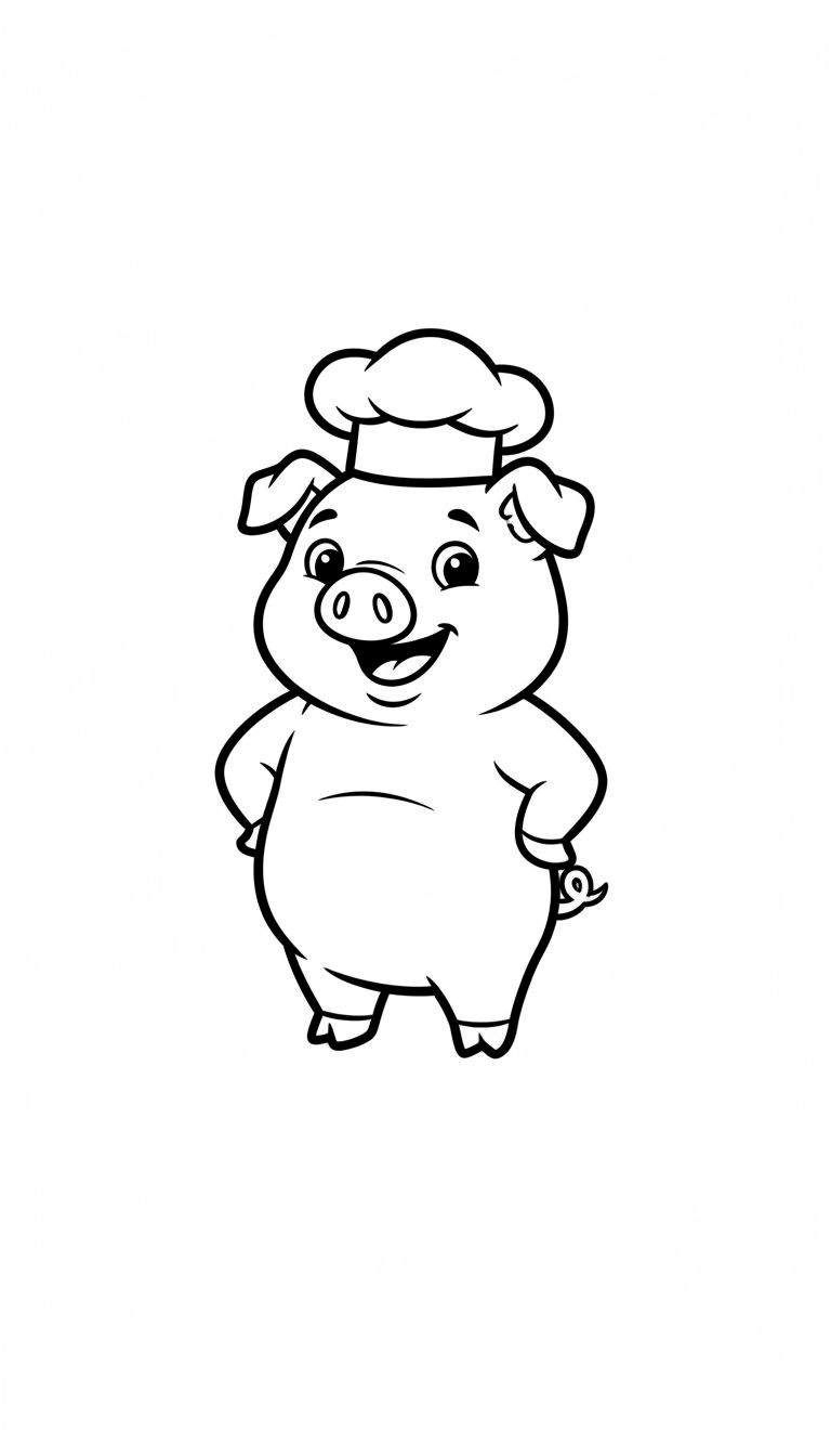 Welkom in de wereld van vrolijke kleuren en blije gezichten! Deze charmante kleurplaat introduceert je aan een onweerstaanbaar cartoonvarken dat klaarstaat om jouw dag op te vrolijken. Met zijn stralende glimlach, ondeugende lachende ogen en een trotse koksmuts op, belichaamt dit varkentje de vreugde van het koken en bakken. Het eenvoudige, maar expressieve ontwerp, gekenmerkt door dikke zwarte lijnen op een helder witte achtergrond, maakt deze kleurplaat een ideale keuze voor zowel beginnende artiesten als de allerkleinsten die hun fijne motoriek willen oefenen.