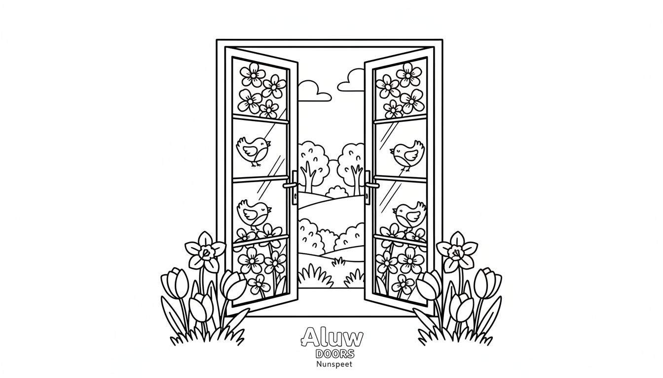 Een charmante zwart-wit kleurplaat van een open dubbele deur of raam, die uitkijkt op een idyllisch, zonnig landschap met glooiende heuvels, bomen en luchtige wolkjes. De deuren zijn verfraaid met bloemen en kuikentjes in de ruitjes. Op de voorgrond bloeien tulpen en narcissen. De tekst ‘Aluw DOORS Nunspeet’ staat onderaan.
