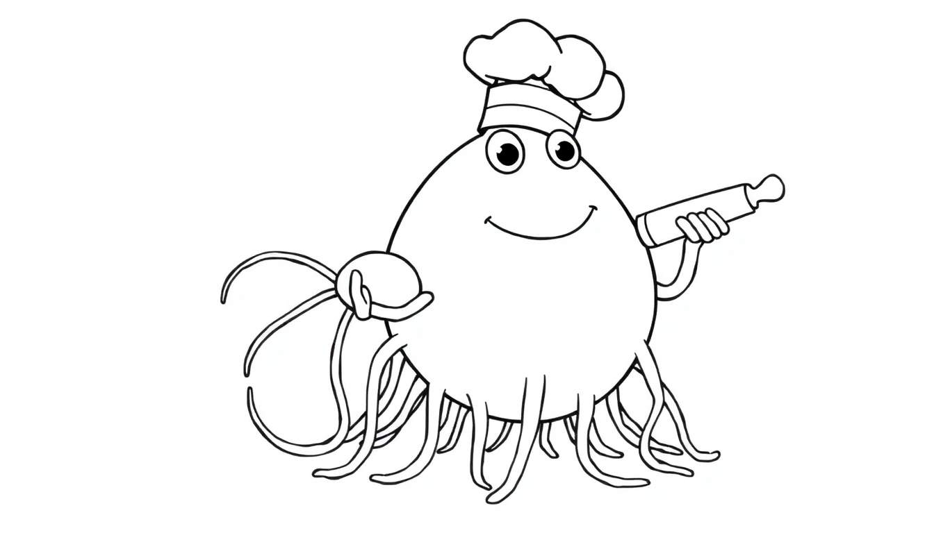In deze betoverende kleurplaat duiken we in de wereld van de culinaire kunst met een wel heel bijzondere chef: een vrolijke, cartoonachtige octopus! Met zijn ronde, mollige lijfje, vriendelijke grote ogen en een brede glimlach straalt hij pure bakvreugde uit. Om zijn pret nog groter te maken, draagt hij trots een klassieke, witte koksmuts op zijn hoofd. Deze zeebewoner is duidelijk geen doorsnee octopus; hij is in zijn element in de keuken!