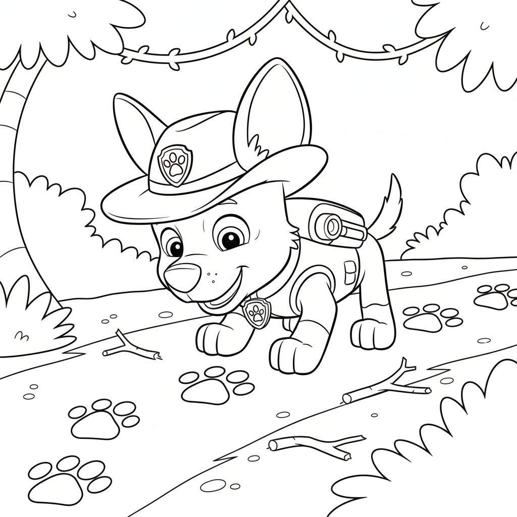 Deze zwart-wit kleurplaat toont een vrolijke en lachende puppy, centraal geplaatst en klaar voor avontuur. De puppy draagt een opvallende brede hoed en een halsband of harnas, beide versierd met een embleem van een pootafdruk. Op zijn rug heeft hij een compact apparaat of rugzakje, wat zijn rol als speurder benadrukt. Met zijn grote, puntige oren en vriendelijke blik lijkt hij door een bosrijke omgeving te sluipen of te wandelen. De grond is bezaaid met verschillende pootafdrukken – sommige al ingekleurd, andere als omtrek – en verscheidene takjes en stokjes. Aan de linkerkant van het tafereel is een deel van een boomstam of struik te zien, terwijl de randen en bovenkant van de afbeelding zijn gevuld met abstracte, golvende lijnen die struiken, bladeren en takken suggereren in een typische tekenfilmstijl. Een paar slingerachtige takjes hangen van bovenaf naar beneden. Het geheel ademt een avontuurlijke en speelse sfeer, perfect om in te kleuren en tot leven te brengen.