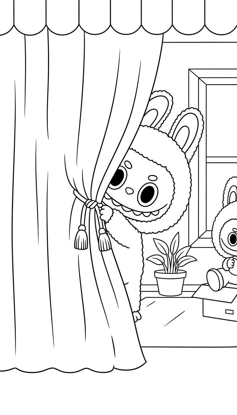 Labubu Kleurplaat: Nieuwsgierige Konijntjes Achter het Gordijn