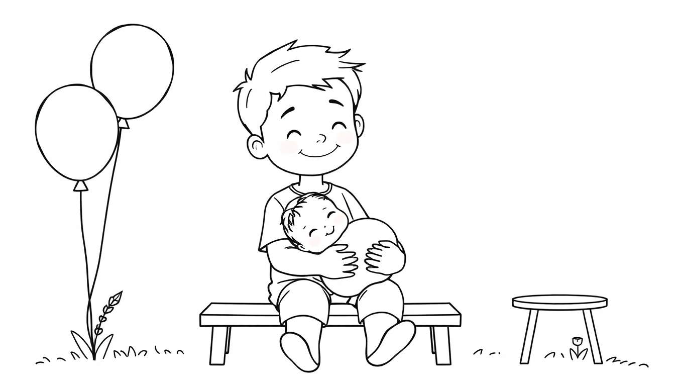 Een charmante zwart-wit lijntekening, perfect als kleurplaat. Centraal staat een lachende jongen die liefdevol een dolgelukkige baby vasthoudt. Om hen heen zweven ballonnen en bloemen, wat zorgt voor een vrolijke en vredige sfeer.