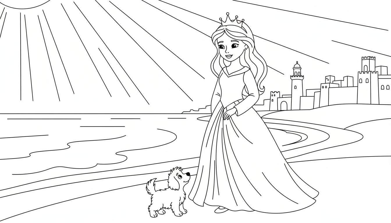 Duik in een wereld vol fantasie met deze prachtige kleurplaat, die een stralende prinses in het middelpunt plaatst. Ze draagt een elegante jurk en een fonkelende kroon, haar lange, golvende haar valt soepel langs haar gezicht terwijl ze met een lieve glimlach naar beneden kijkt. Aan haar voeten staat haar trouwe, pluizige metgezel, een hond die vol bewondering opkijkt. Samen staan ze op een schilderachtig pad dat zich slingert langs een schitterende waterpartij. Stel je de geluiden van de kabbelende golven voor en de frisse bries die door hun haren waait. De achtergrond onthult een adembenemend stadsgezicht of een majestueus kasteel, met torens en muren die getuigen van eeuwenoude verhalen. De zon schijnt vrolijk aan de hemel in de linkerbovenhoek, haar gouden stralen moedigen je aan om je creativiteit de vrije loop te laten.